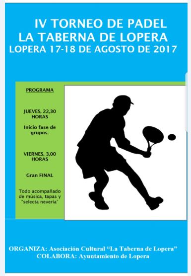 La Asociación Cultural "La Taberna de Lopera", en colaboración con el Ayuntamiento de Lopera, organiza el IV TORNEO DE PADEL LA TABERNA DE LOPERA, los días 17 y 18 de agosto de 2017.