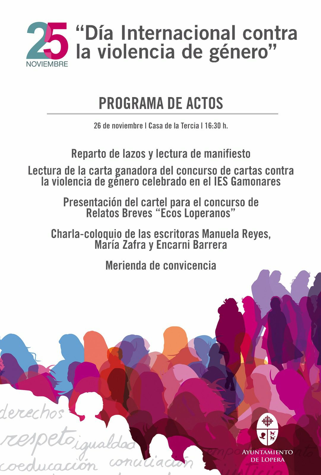 En el día de hoy, enmarcado dentro del programa de actos del "Día Internacional contra la Violencia de Género", se ha procedido, en la Casa de la Tercia de Lopera, a la presentación del VI Certamen de Relatos Breves "Ecos Loperanos", organizado por La Asociación Cultural La Taberna de Lopera, en colaboración con el Excmo. Ayuntamiento de Lopera, la Diputación Provincial de Jaén y la Fundación Caja Rural de Jaén.